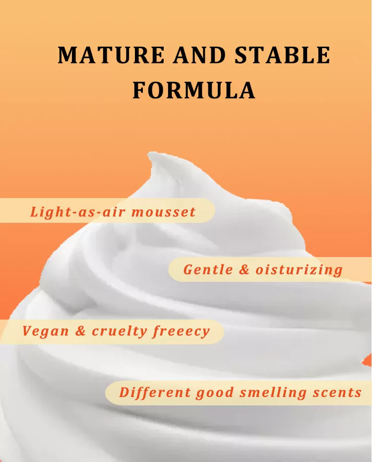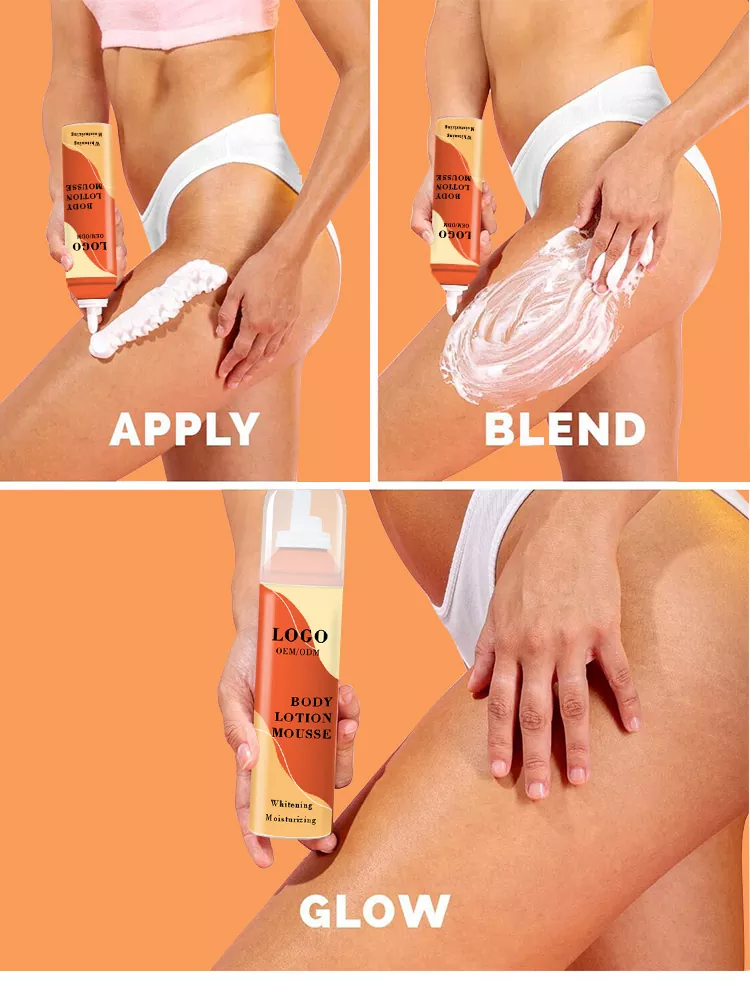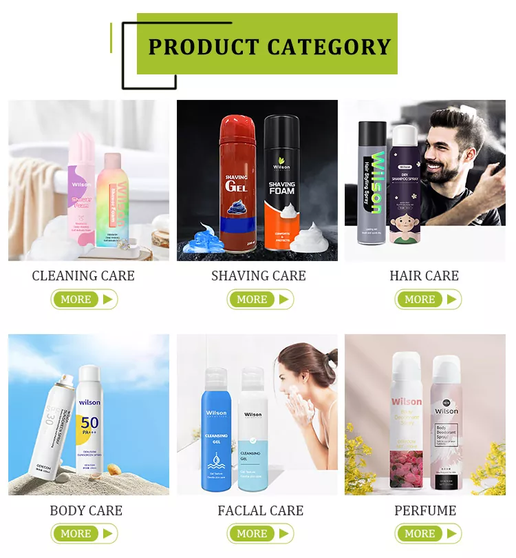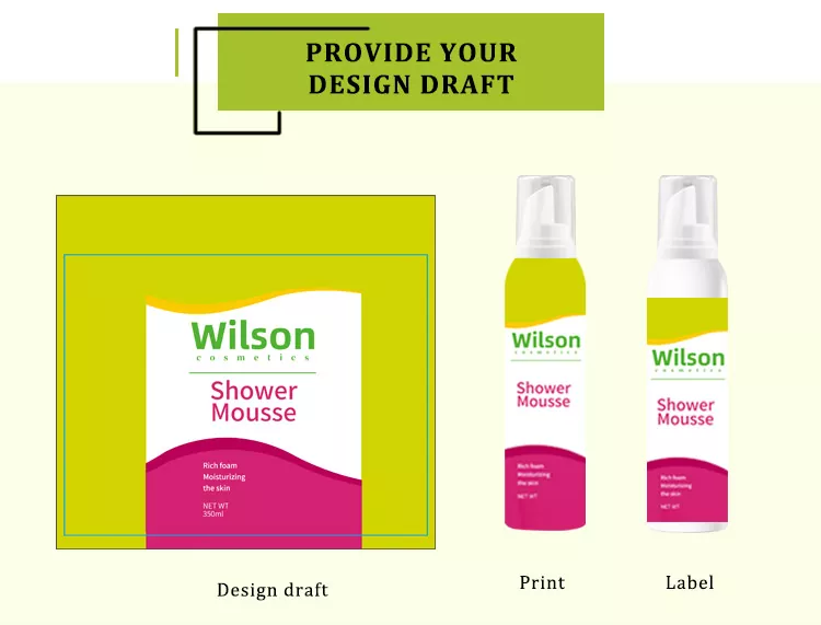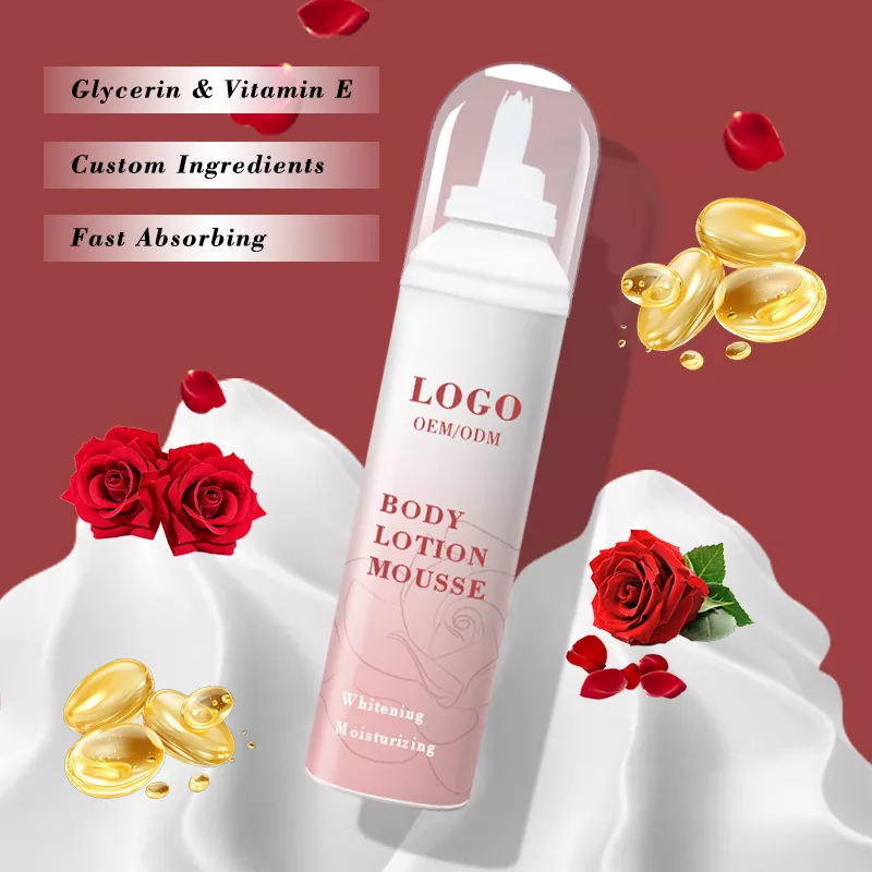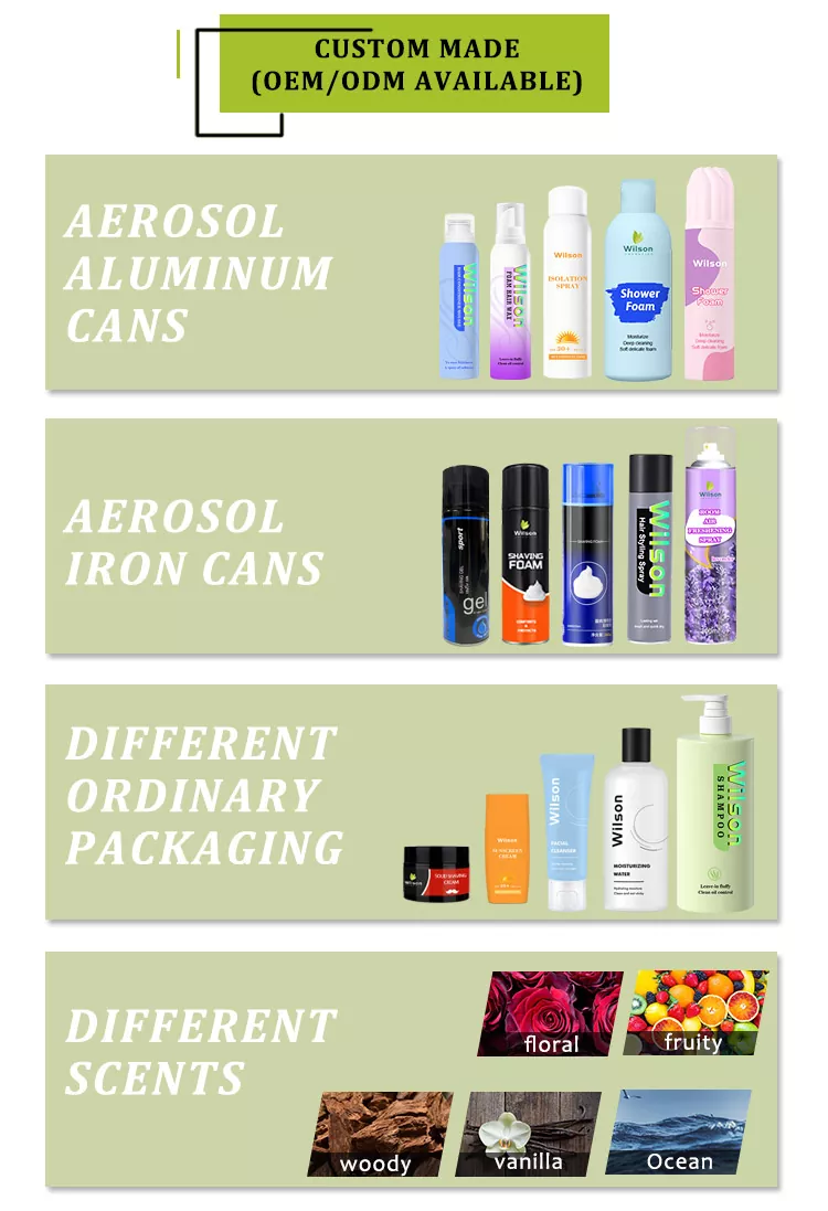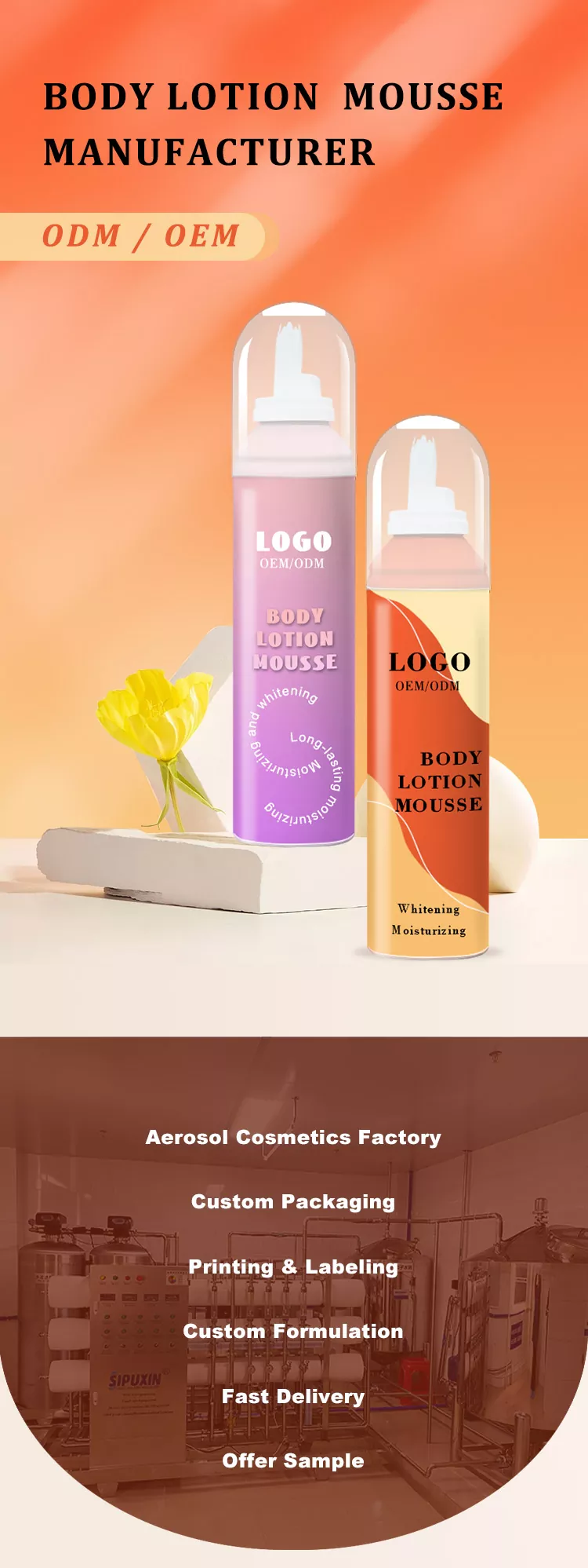 Wilson Quick Absortion Lightweight Texture Body Lotion Mousse es un humectante de larga duración que puede ser absorbido por el cuerpo. Nuestra mousse viene en forma de aerosol en una lata de aluminio, que produce una rica espuma al presionarla. En comparación con la sensación pesada y pegajosa de las lociones tradicionales, nuestro Body Mousse aporta un toque ligero, como una nube suave y densa. Además, tenemos una variedad de formulaciones para elegir, por ejemplo, puede agregar a la fórmula que contiene extractos humectantes altamente efectivos como ácido hialurónico múltiple, extractos de plantas naturales, etc., que pueden hacer que la microestructura de la espuma sea más propicia para la composición de los ingredientes directamente debajo de la piel, de modo que tenga una hidratación intensiva y un efecto humectante duradero y duradero en la piel. La piel se hidrata de adentro hacia afuera.
