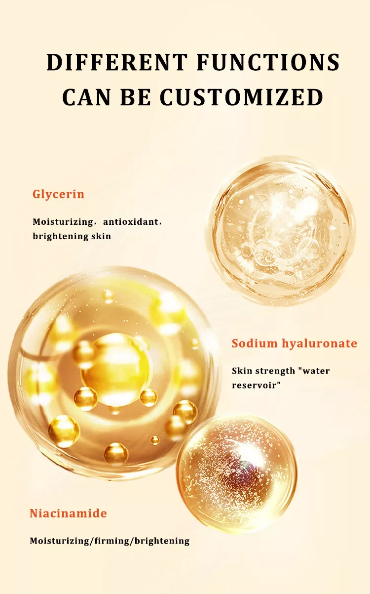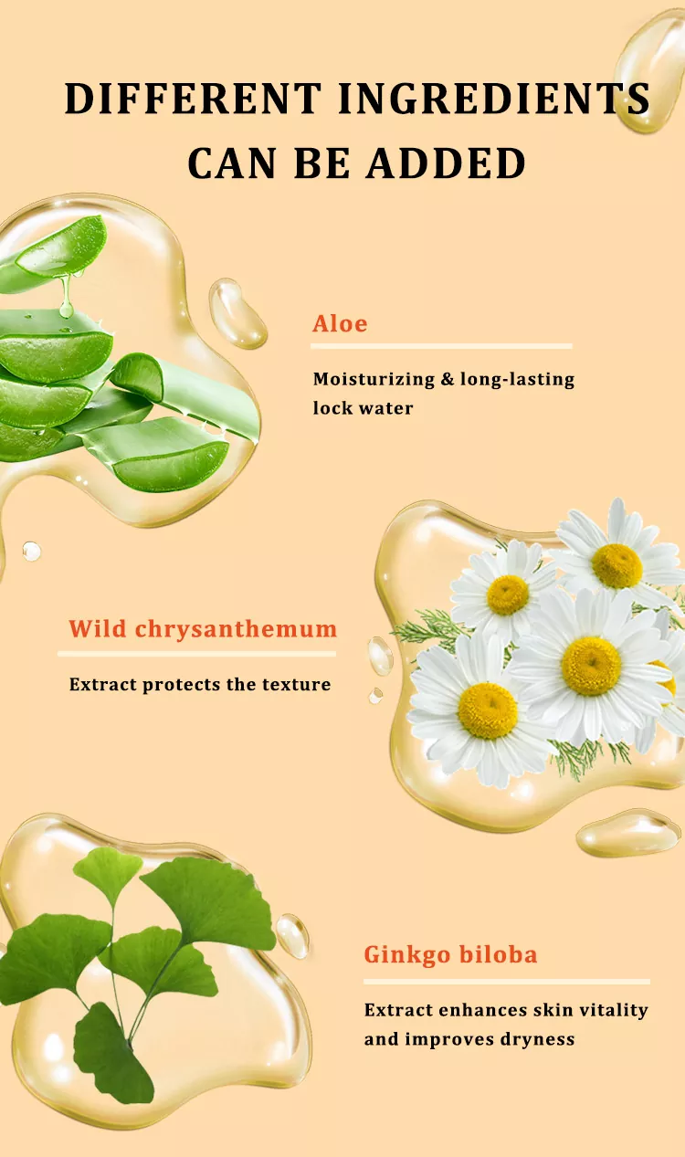 También podemos personalizar la fórmula que desee en función de los ingredientes específicos del producto (por ejemplo, ácido hialurónico principal, niacinamida, vitamina E, extractos de plantas específicos, etc.), fragancia (por ejemplo, rosa, té blanco, sin perfume, etc.) y si tiene efectos especiales (por ejemplo, reparación fuerte, blanqueamiento, reafirmante, etc.).